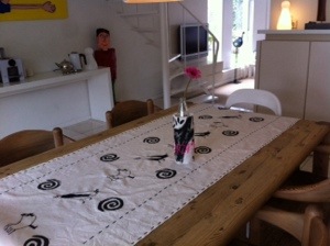 Blog keukentextiel Tafelloper Tafelloper Geborduurd en ingekleurd met textielverf, gestempeld ook met textielverf 30 maart 2014 In: keukentextiel